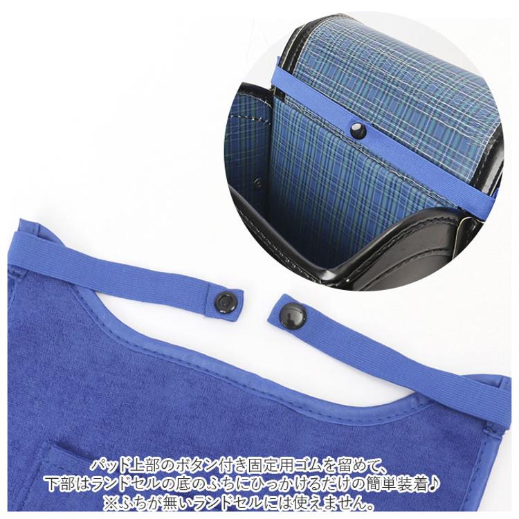 ・パッド上部のボタン付き固定用ゴムを留めて、下部はランドセルの底のふちにひっかけるだけの簡単装着♪(※ふちが無いランドセルには使えません。)