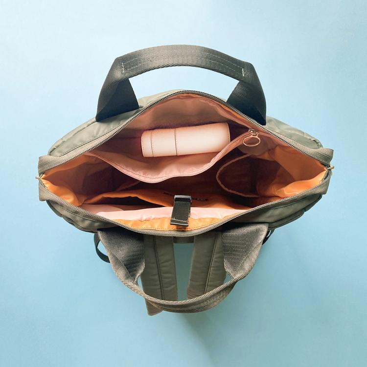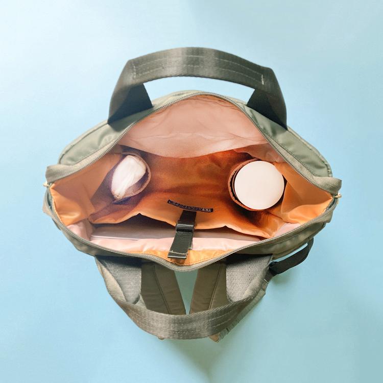 ・貴重品などの収納に。内側両サイドにはボトルホルダーと小物用ポケットがあります。