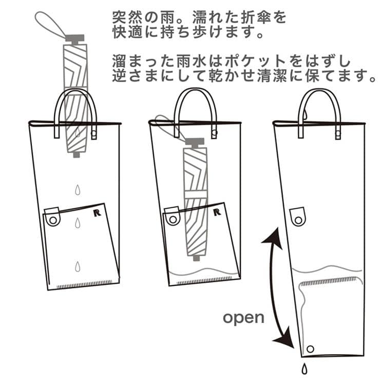 ・前面のルーポケットには、濡れたところを拭き取るハンカチや折傘外袋などを入れておけます。