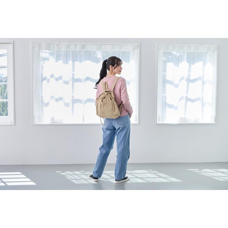 ・口元はドローストリング&ドットボタン開閉。A4サイズも縦に収納可能です。