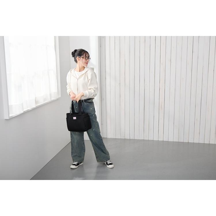・片側に寄せて全体のスペースを広く使うこともできます。底マチが広く、ランチボックスなども入ります。