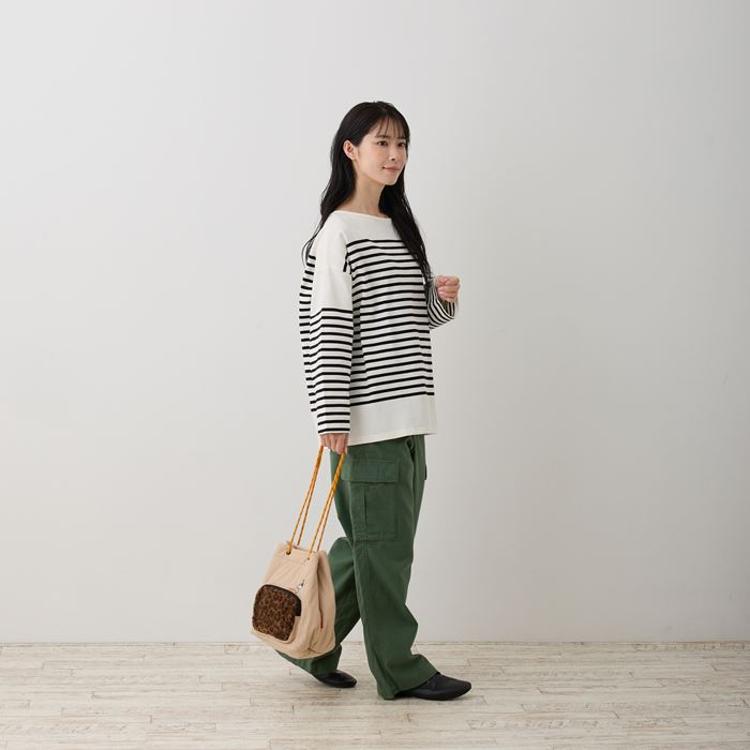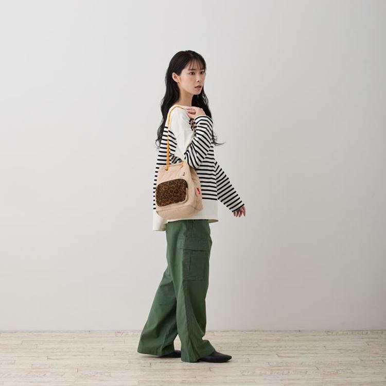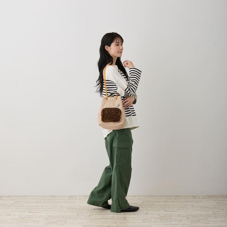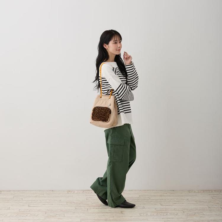 2本の持ち手で、手持ちにしたり、肩掛けにしたり。1本で絞れば、斜め掛けもできます。
