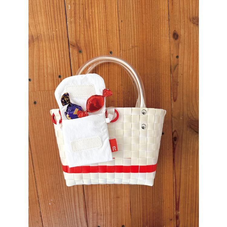 ・カラフル&ハリのある荷造りテープが素材。ベビールーサイズのトートに編み上げました。