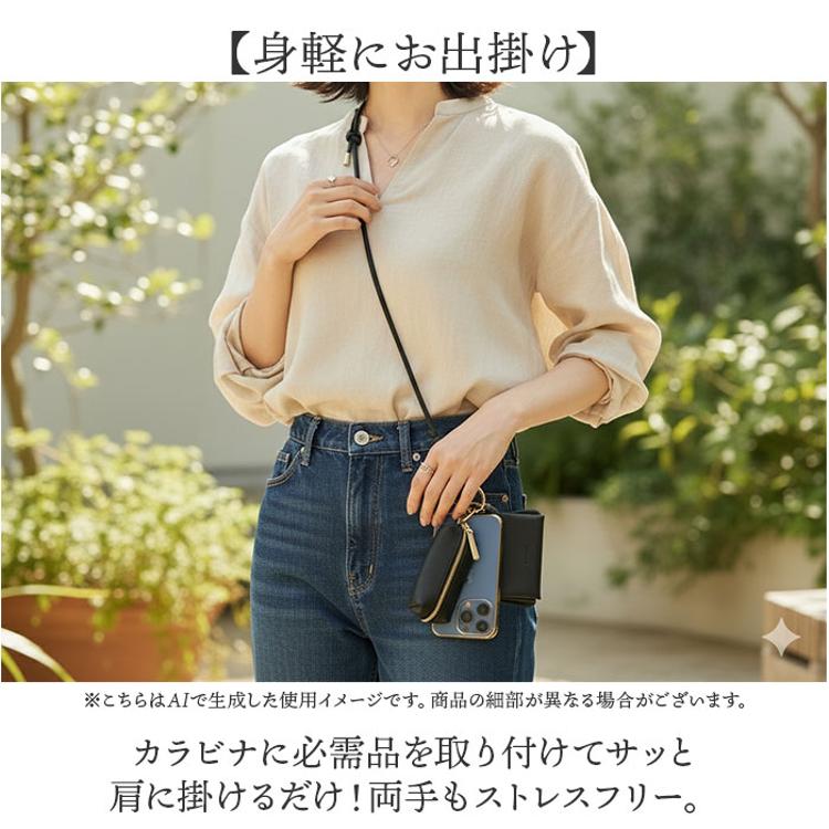 ・カラビナに必需品を取り付けてサッと肩に掛けるだけ!両手もストレスフリー。
