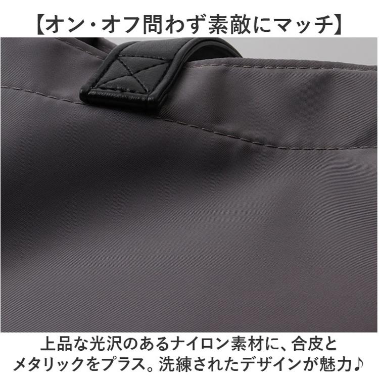 ・上品な光沢のあるナイロン素材に、合皮とメタリックをプラス。洗練されたデザインが魅力♪