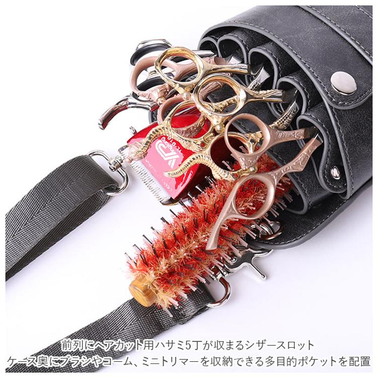 ・前列にヘアカット用ハサミ5丁が収まるシザースロット。ケース奥にブラシやコーム、ミニトリマーを収納できる多目的ポケットを配置。