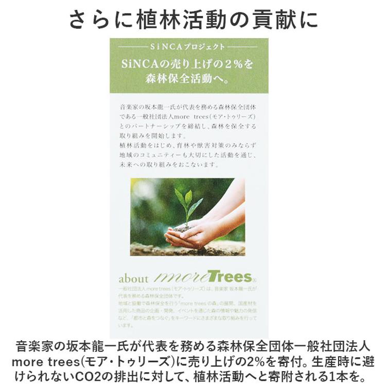 ・音楽家の坂本龍一氏が代表を務める森林保全団体一般社団法人more trees(モア・トゥリーズ)に売り上げの2%を寄付。生産時に避けられないCO2の排出に対して、植林活動へと寄附される1本を。