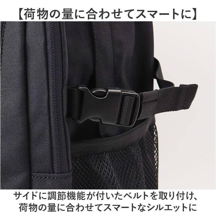 ・サイドに調節機能が付いたベルトを取り付け、荷物の量に合わせてスマートなシルエットに