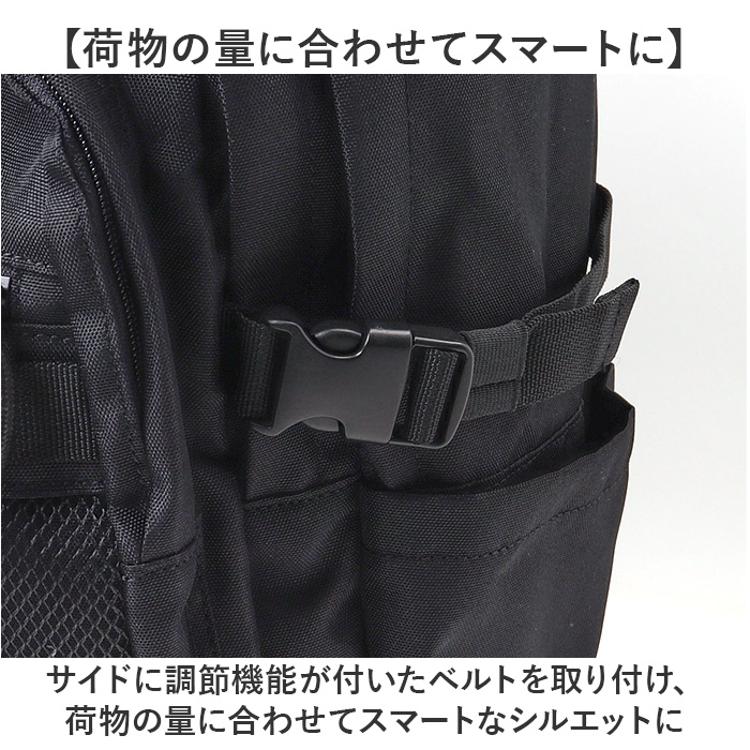 ・サイドに調節機能が付いたベルトを取り付け、荷物の量に合わせてスマートなシルエットに