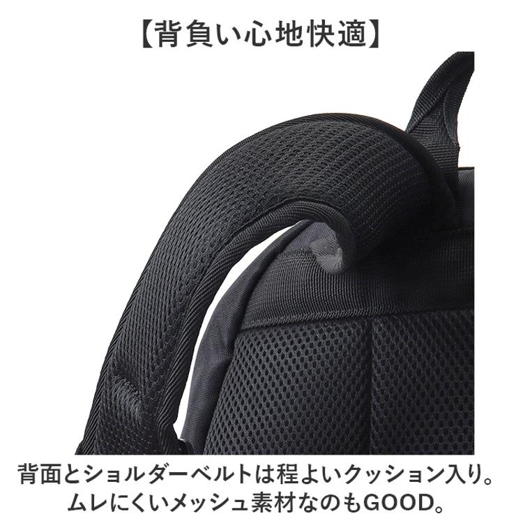 ・背面とショルダーベルトは程よいクッション入り。ムレにくいメッシュ素材なのもGOOD。