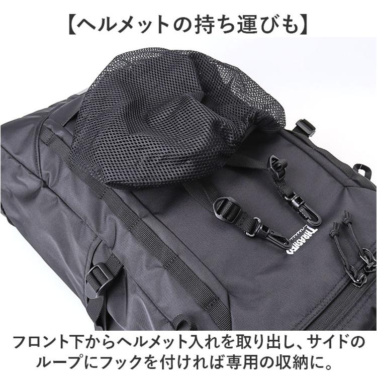 ・フロント下からヘルメット入れを取り出し、サイドのループにフックを付ければ専用の収納に。