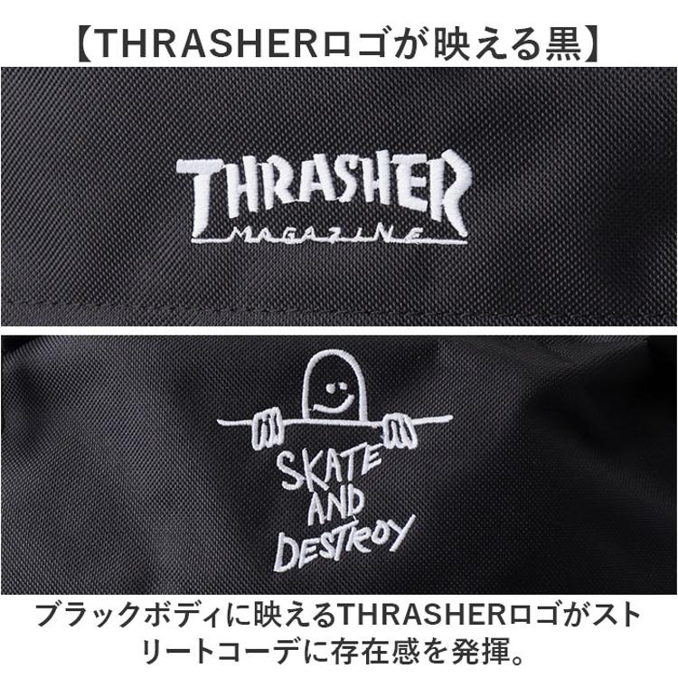 ・ブラックボディに映えるTHRASHERロゴがストリートコーデに存在感を発揮。