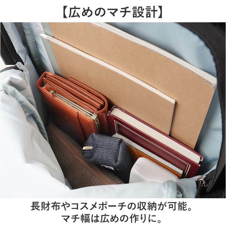 ・長財布やコスメポーチの収納が可能。マチ幅は広めの作りに。