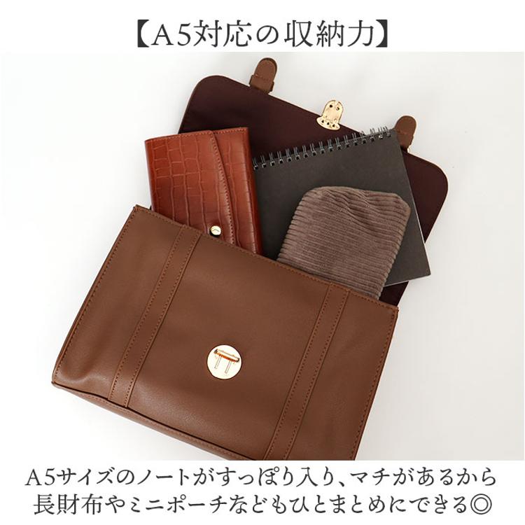 ・A5サイズのノートがすっぽり入り、マチがあるから長財布やミニポーチなどもひとまとめにできる◎