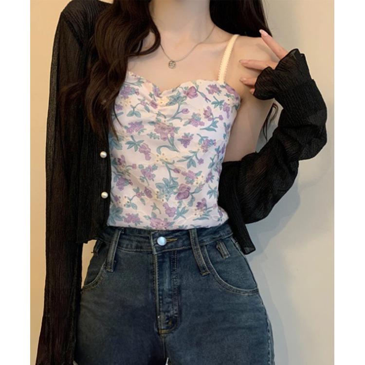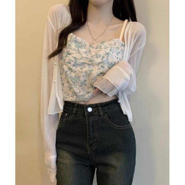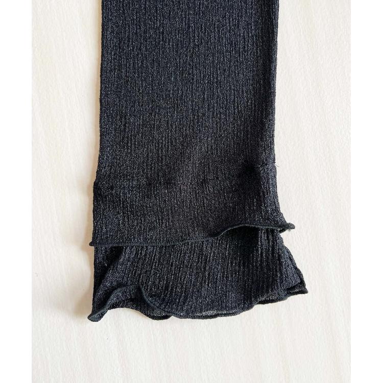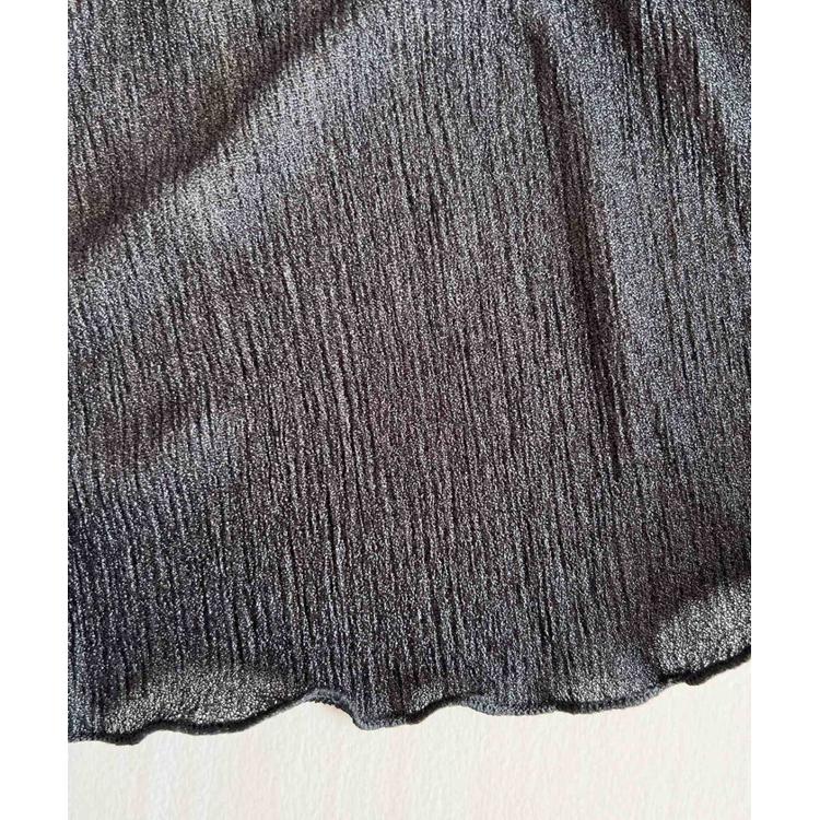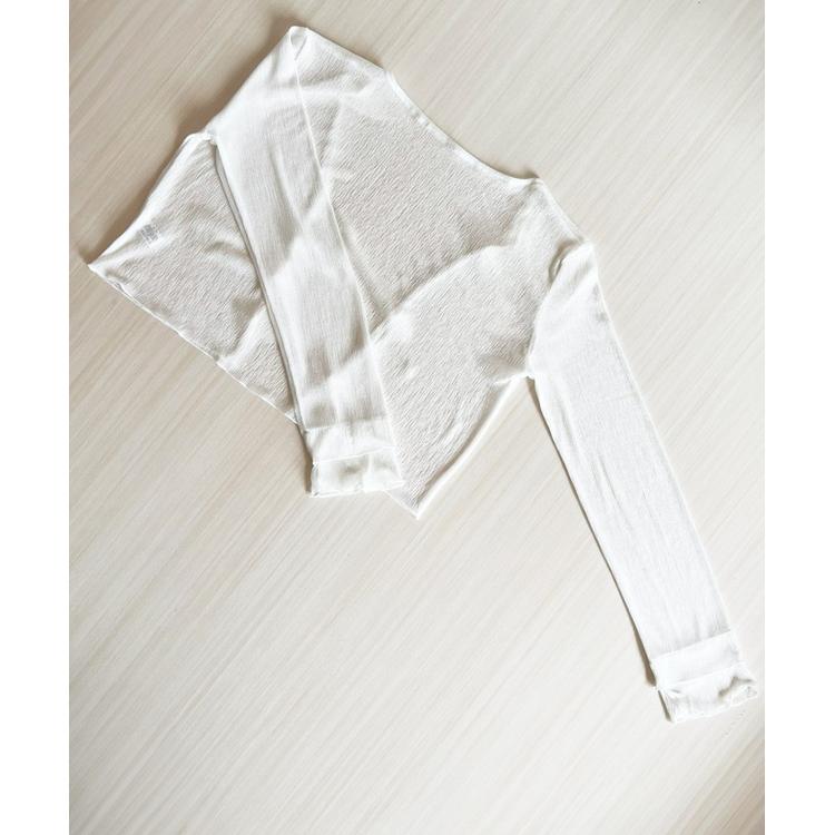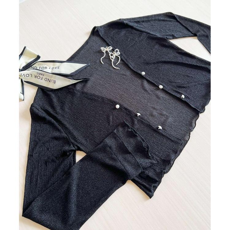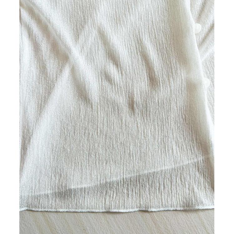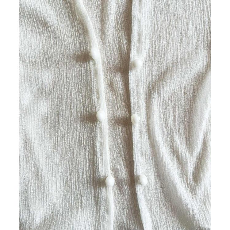 ・軽やかなシアー素材にフレアスリーブとさりげないパールボタンを添え、シンプルながらも洗練された印象に。