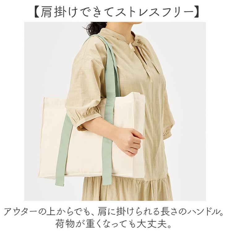 ・ナチュラルな風合いのキャンバス素材に、長いハンドルがアクセント。コーデを選ばず長く愛用。