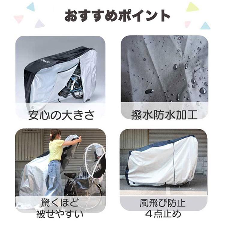 ・前後の子供乗せシートもすっぽり覆える大型設計で、電動自転車を丸ごと保護できる安心感◎
