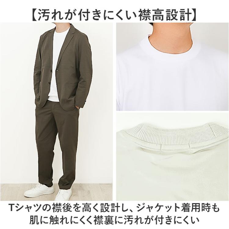 ・Tシャツの襟後を高く設計し、ジャケット着用時も肌に触れにくく襟裏に汚れが付きにくい