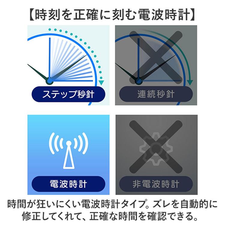 ・時間が狂いにくい電波時計タイプ。ズレを自動的に修正してくれて、正確な時間を確認できる。