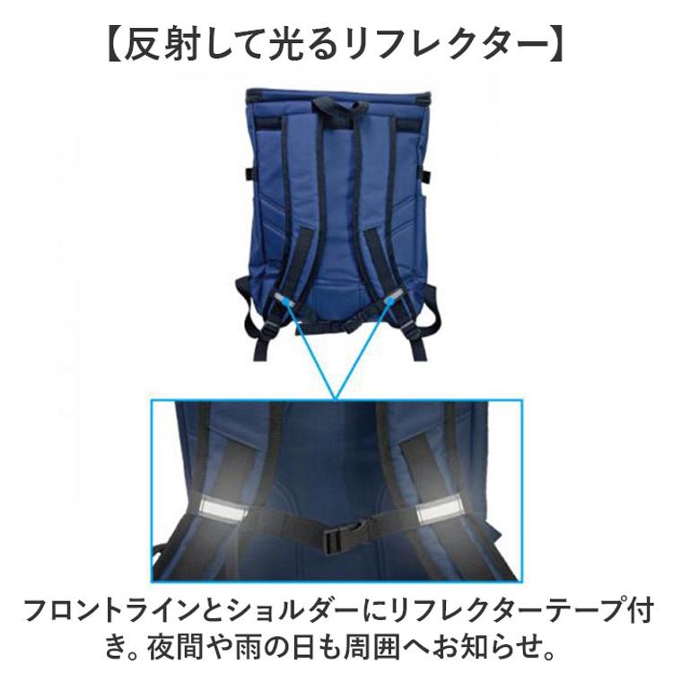 ・フロントラインとショルダーにリフレクターテープ付き。夜間や雨の日も周囲へお知らせ。