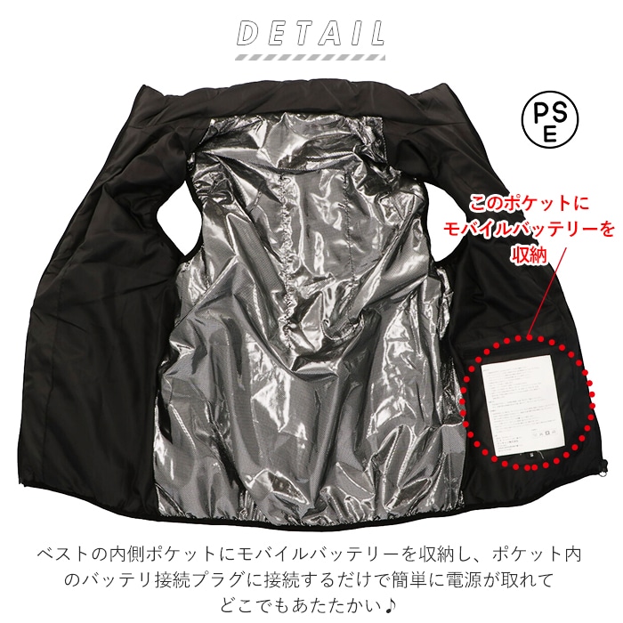 ・ベストの内側ポケットにモバイルバッテリーを収納し、ポケット内のバッテリ接続プラグに接続するだけで簡単に電源が取れて、どこでもあたたかい♪