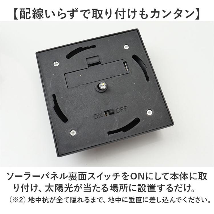 ・ソーラーパネル裏面スイッチをONにして本体に取り付け、太陽光が当たる場所に設置するだけ。