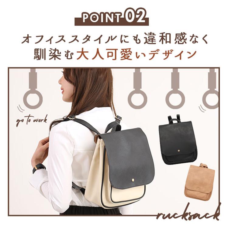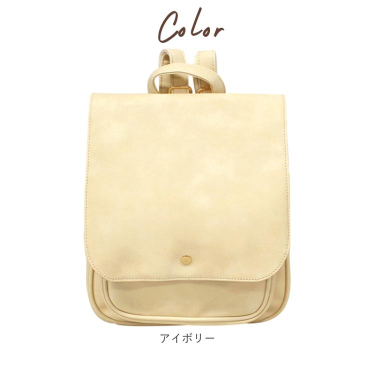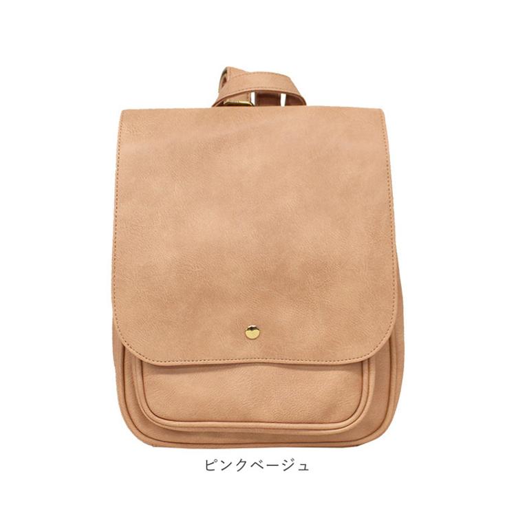 商品説明・角のとれたほんのり柔らかなフォルムと、大きめフラップが可愛い!ONでもOFFでも使えるフェイクレザー・フラップミニリュック。