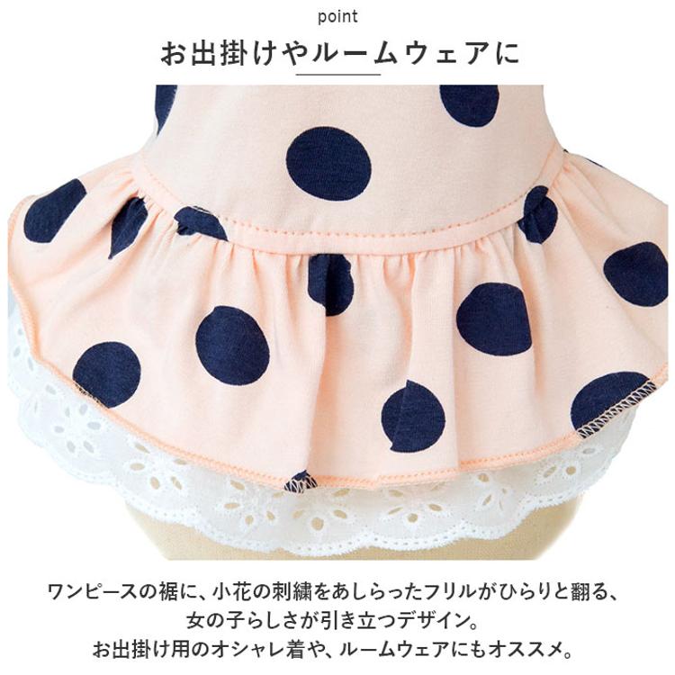 ・ワンピースの裾に、小花の刺繍をあしらったフリルがひらりと翻る、女の子らしさが引き立つデザイン。お出掛け用のオシャレ着や、ルームウェアにもオススメ。