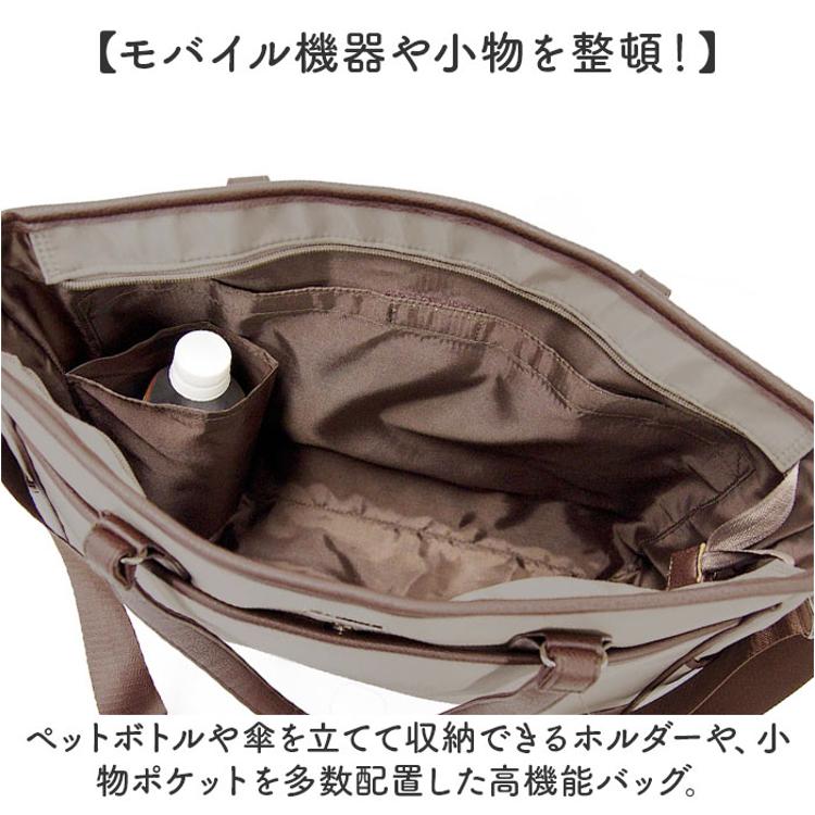 ・ペットボトルや傘を立てて収納できるホルダーや、小物ポケットを多数配置した高機能バッグ。