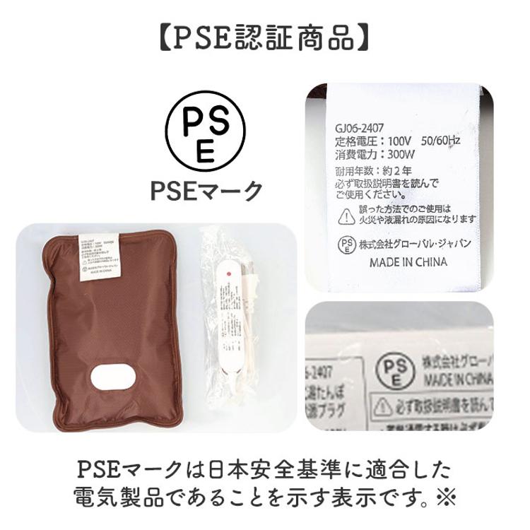 ・PSEマークは日本安全基準に適合した電気製品であることを示す表示です。※PSEマークは湯たんぽ本体のタグに記載があります。
