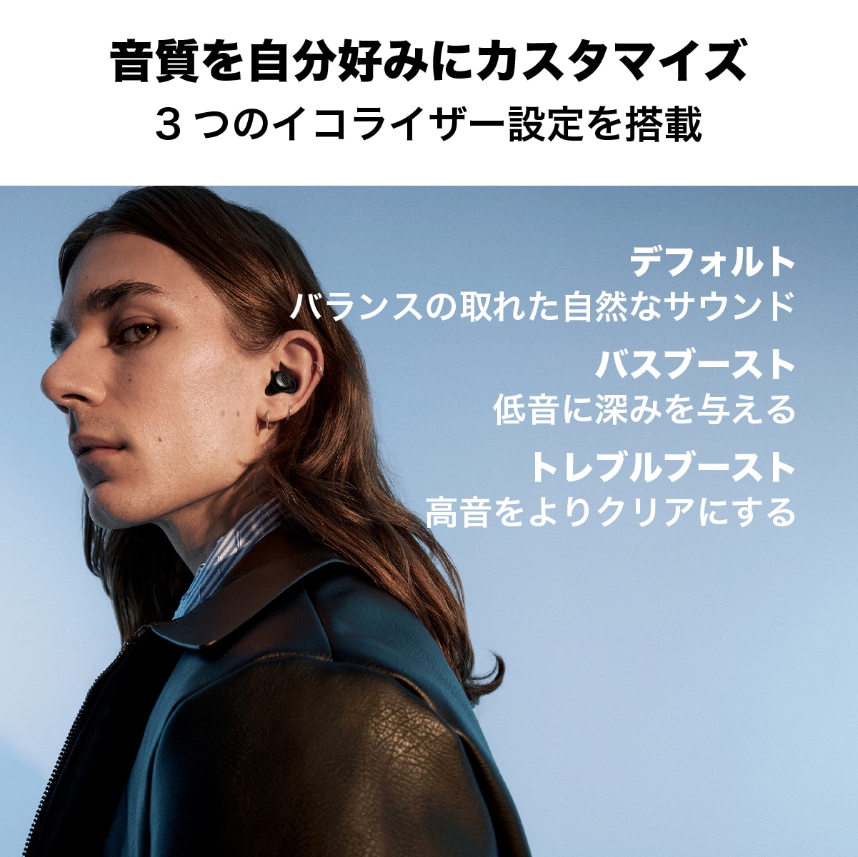 バランスの取れた自然なサウンドの「デフォルト」、低音を豊かに響かせる「バスブースト」、高音を鮮やかに際立たせる「トレブルブースト」から選べます。
