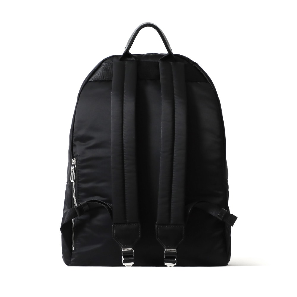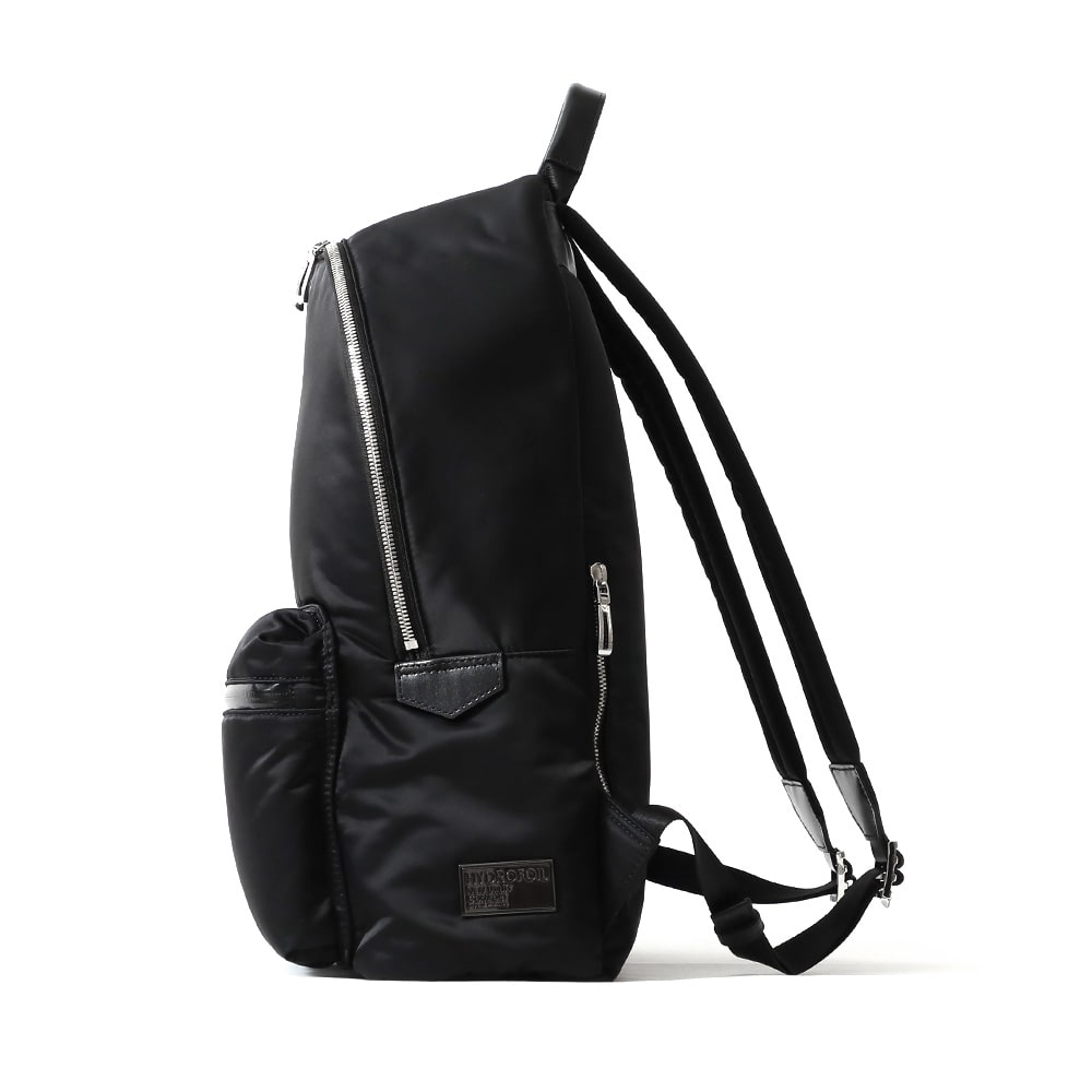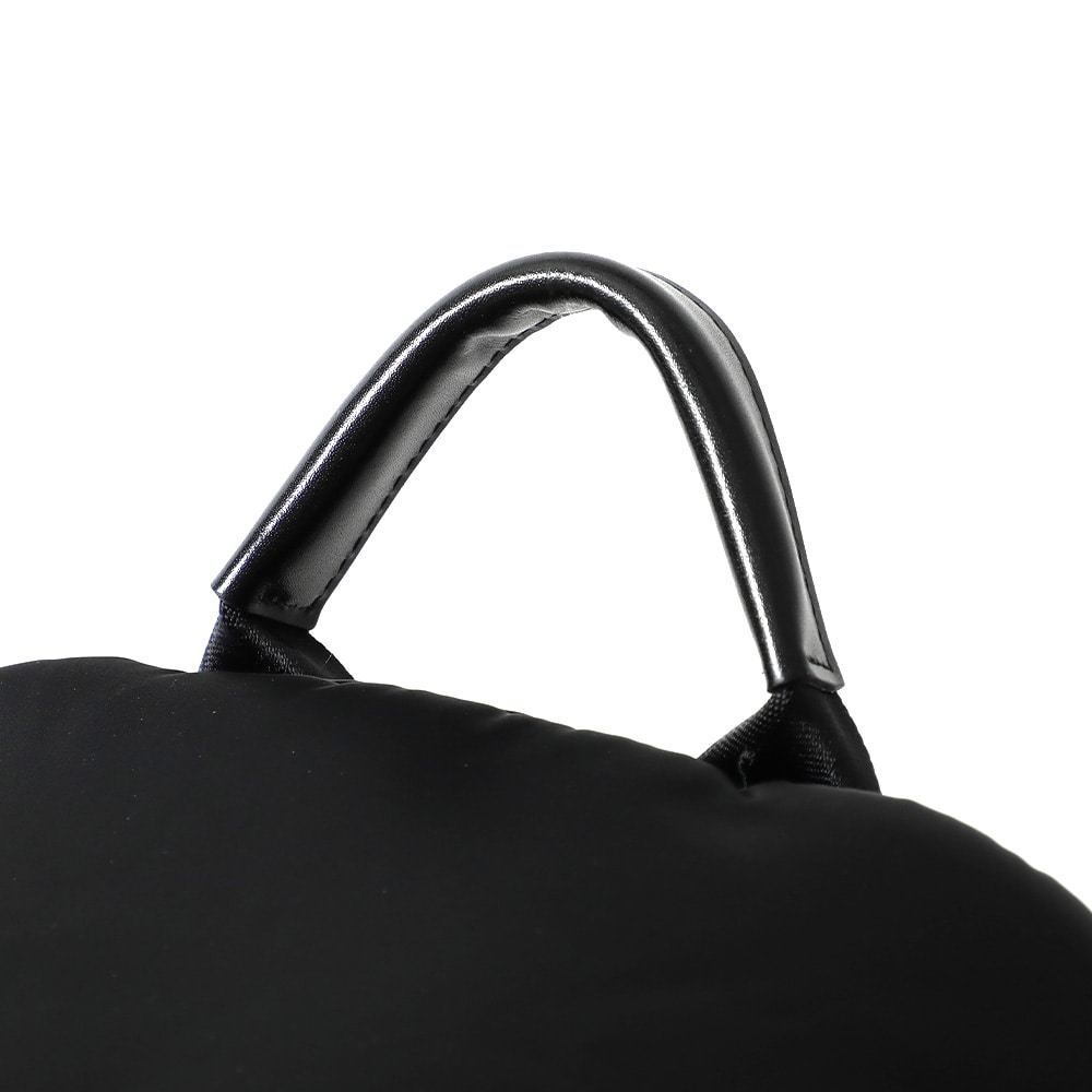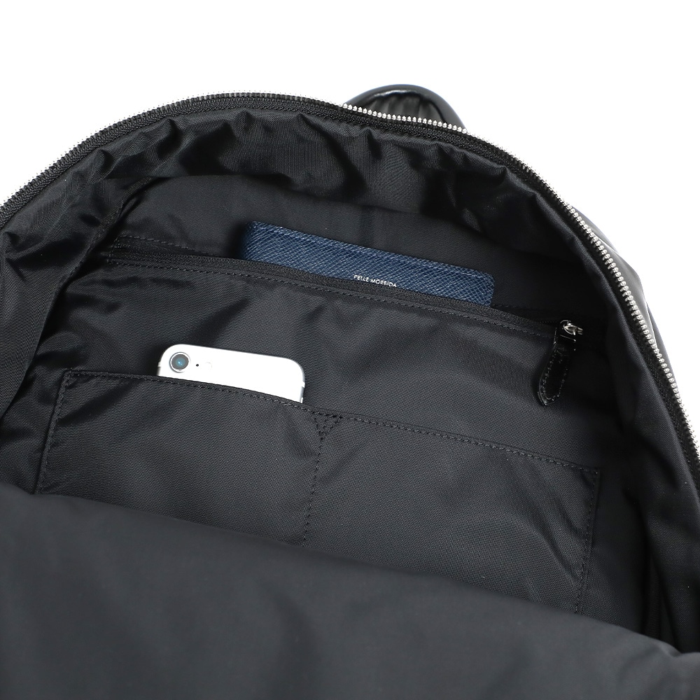 素材の光沢感がジャケットスタイルにも合う上品な仕上がりのデザイン。上部のハンドルにはレザーを使用しており、手持ちもできます。