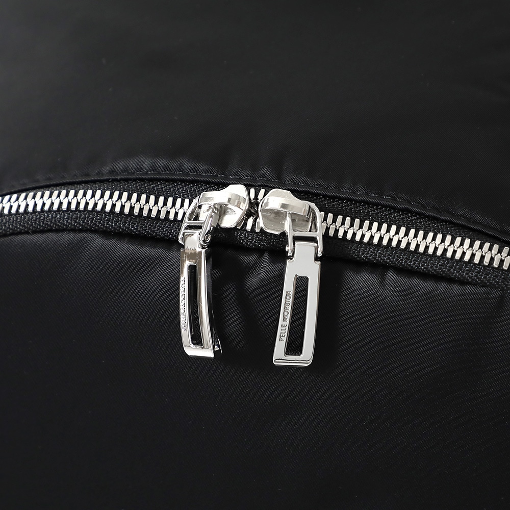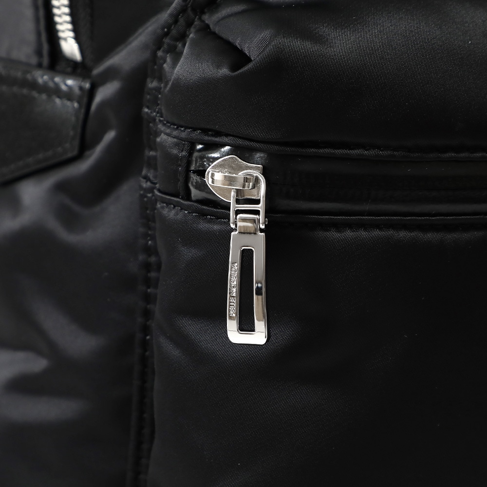 素材の光沢感がジャケットスタイルにも合う上品な仕上がりのデザイン。上部のハンドルにはレザーを使用しており、手持ちもできます。マチ幅が大きいので一泊程度の出張や小旅行にも使えます。
