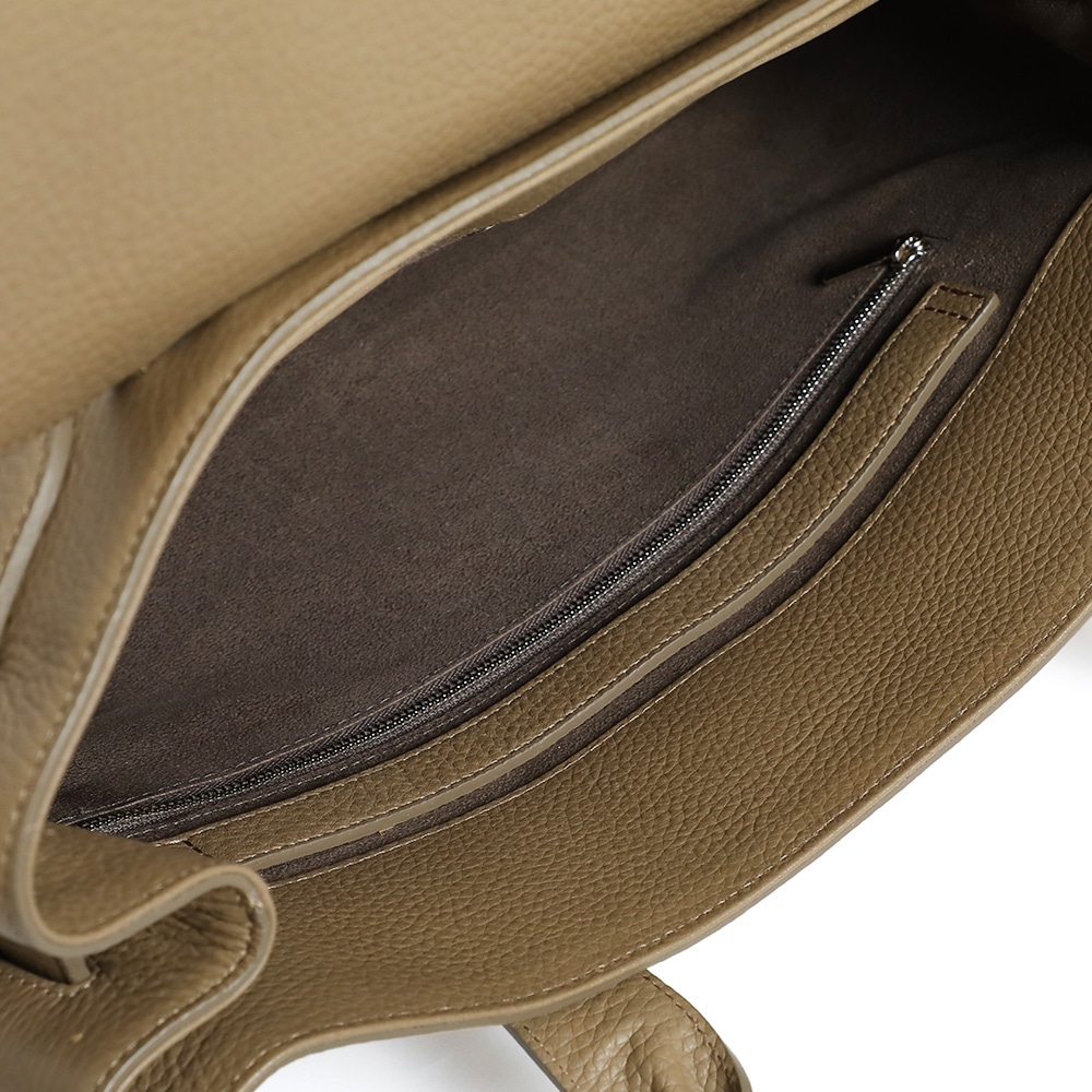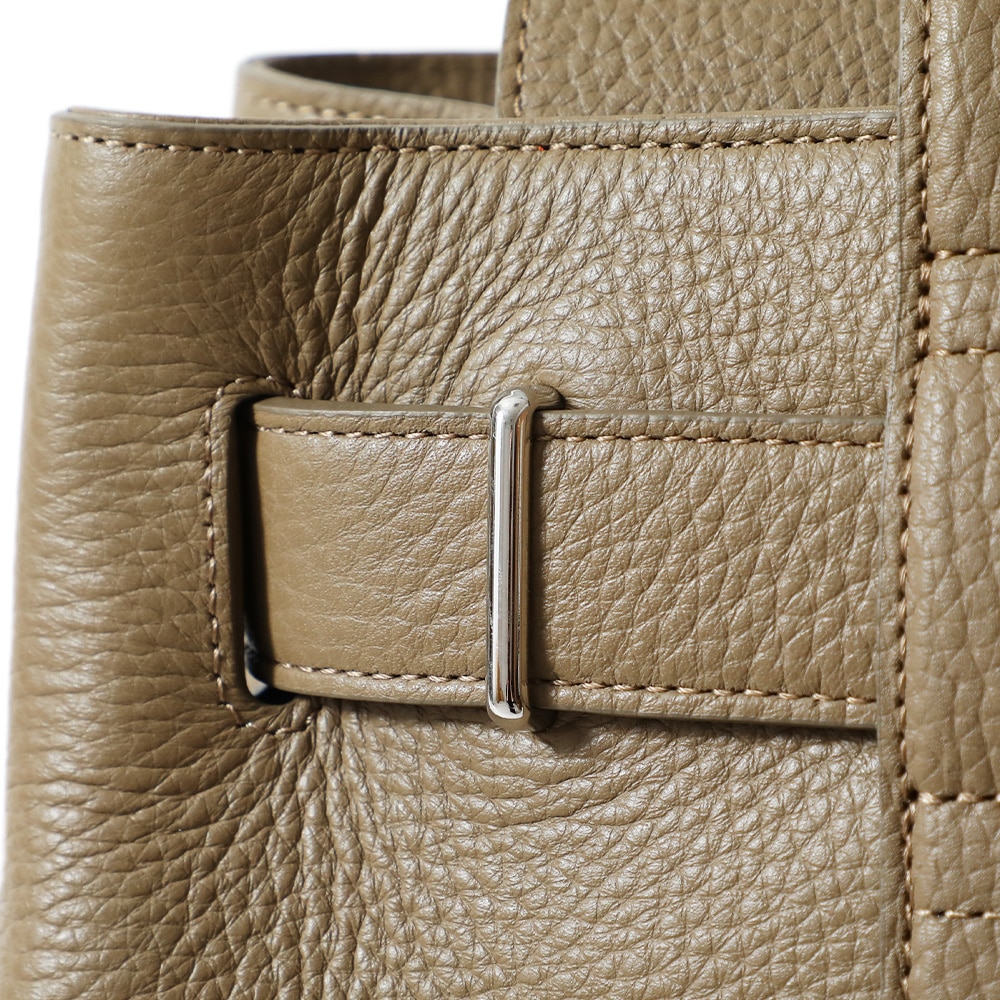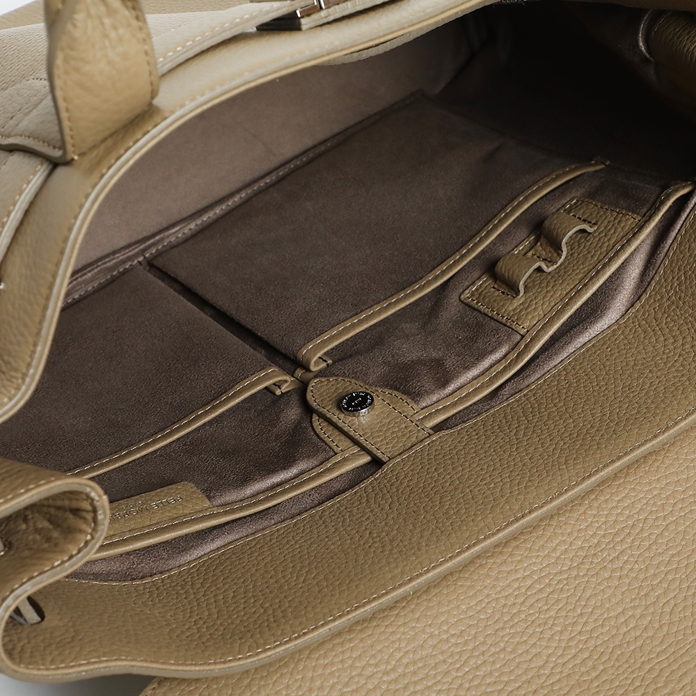 シュリンクの柔らかさを活かした、ゆったりとした安定感あるサイズ感に仕上がりました。口開きが広く物の出し入れがしやすいにも関わらず、中央のフラップにより中身が見えないため安心感のある仕様です。