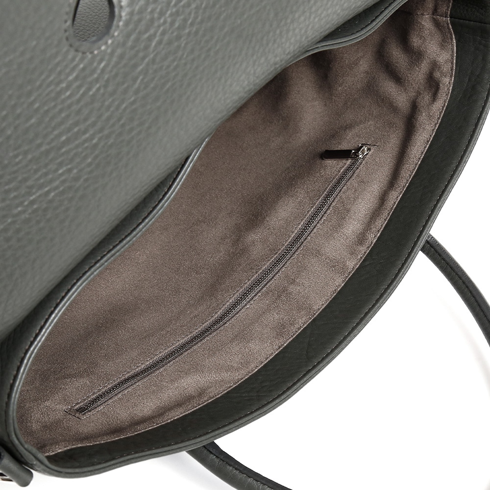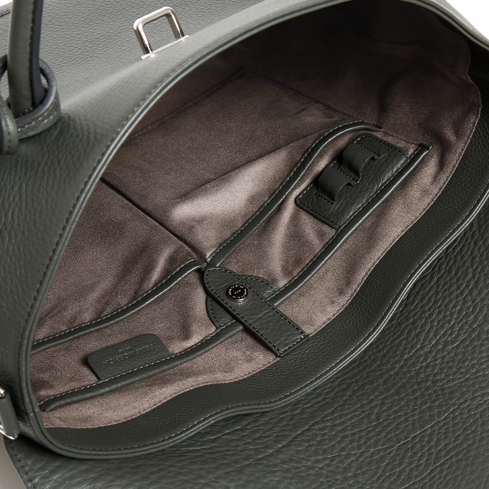コンパートメントされたポケットやペン差しなど、スッキリスマートに収納できる内装。ポケットは、スマホなどを入れるのにも便利です。ボトムは底びょう付きで置いて使うのも安心。被せの部分のベルトは1本でとてもシンプルな作りになっているので、開け閉めも簡単。優に肩にかけられるハンドルの高さも魅力的です。