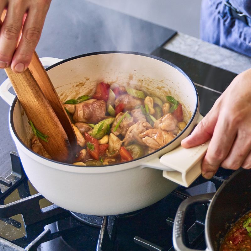 マルチスタンドは、調理時も使用することができます。ポットホルダー同様にシリコン製なので、何度でも洗えて衛生的です。