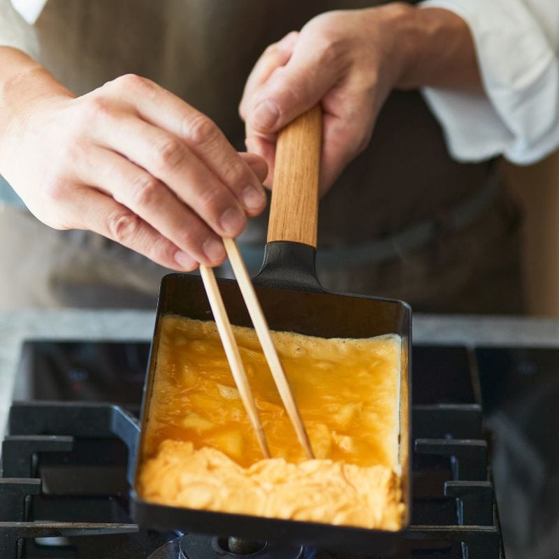お弁当の定番おかず「だし巻き玉子」。EGG & TOAST PANで調理すれば、熟練の職人にしか出せない、あの旨みと食感をご家庭で。蓄熱性の高い鋳物と瞬間蒸発ホーローにより、凝縮した卵の旨みを味わえます。鋳物の限界まで底面内側の角を小さく、垂直に立てた形状により、卵液を広げやすく、カタチもしっかり決まります。