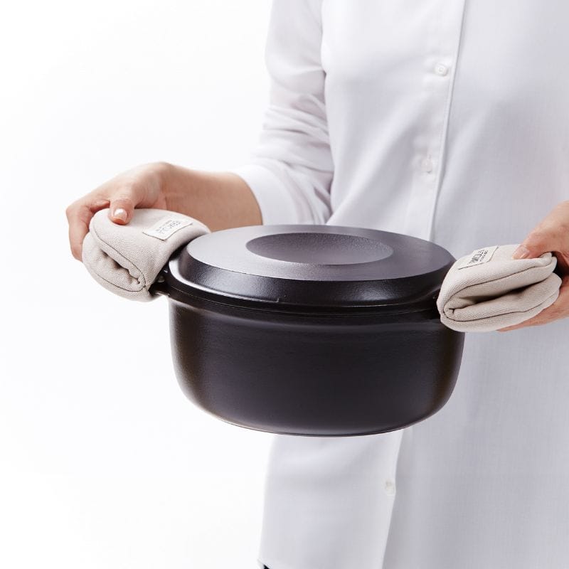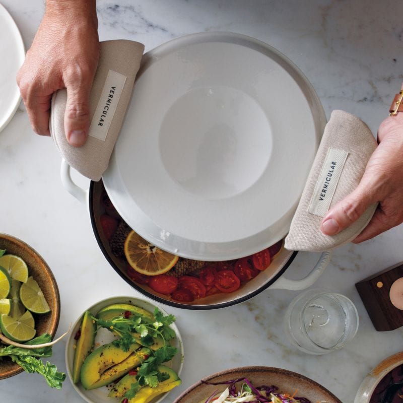 バーミキュラで作った、あつあつのおいしい料理を鍋ごと食卓に運ぶことができるポットホルダー(鍋つかみ)。蓋のつまみなどを持つ簡易ミトンとしても使え、バーミキュラオーナー必需品のアイテムです。