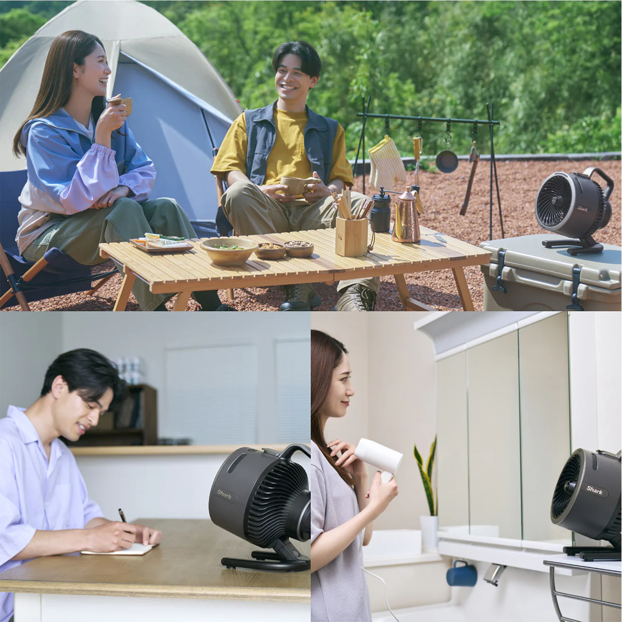コード付きでもコードレスでも使えるから、リビングからコードを外してキッチンや脱衣所に持ち運んだり、庭に出して涼んだり。キャンプなどのアウトドアにも持って行くことができます。