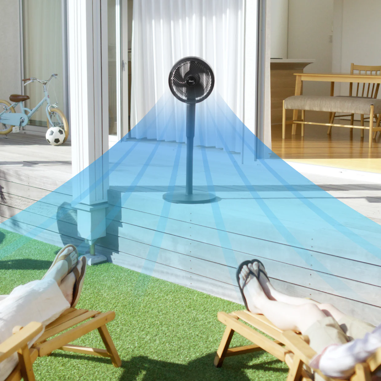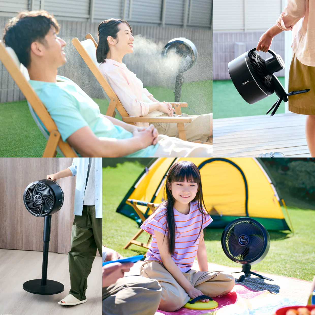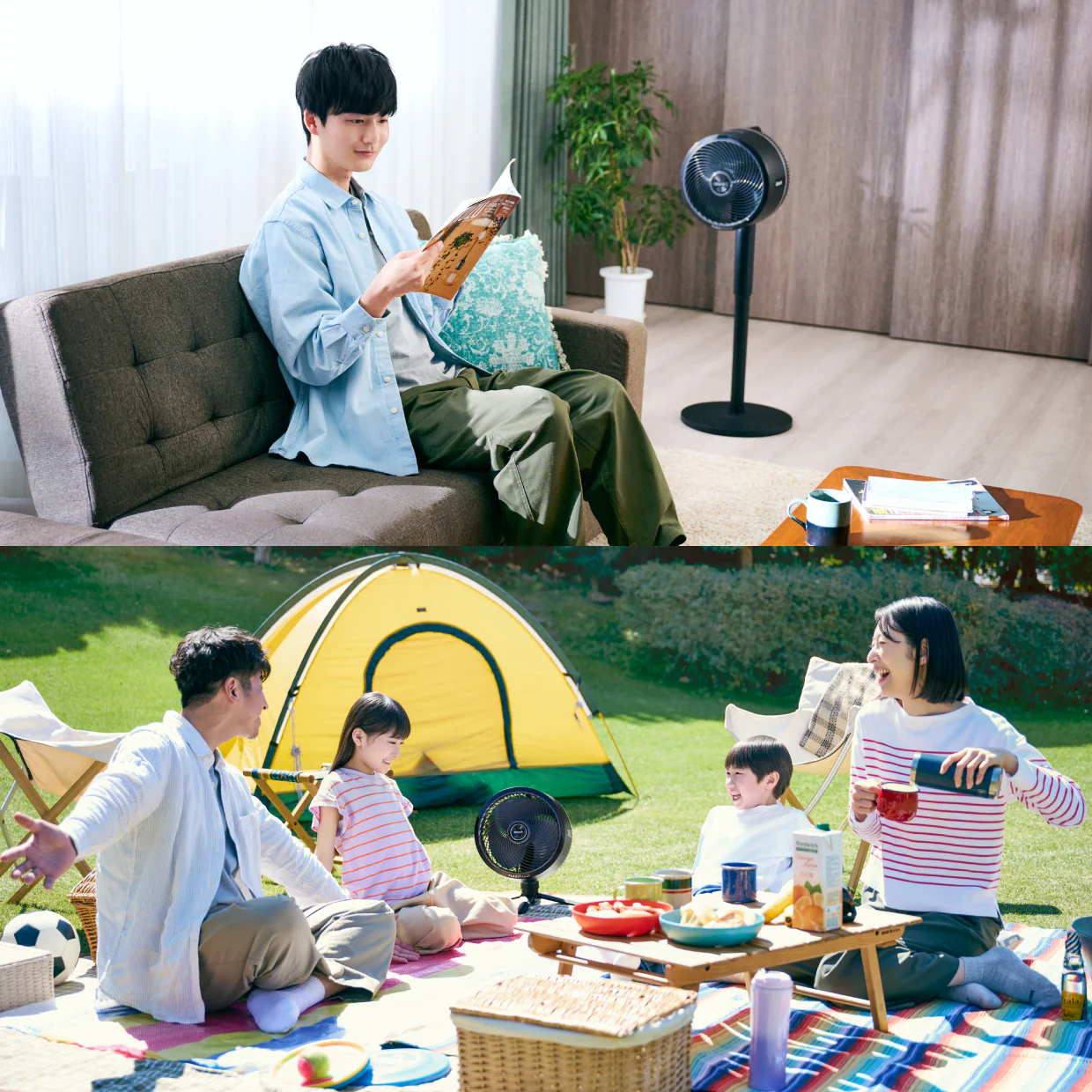 コード付きでもコードレスでも使えるから、リビングからコードを外してキッチンや脱衣所に持ち運んだり、庭に出して涼んだり。キャンプなどのアウトドアにも持って行くことができます。