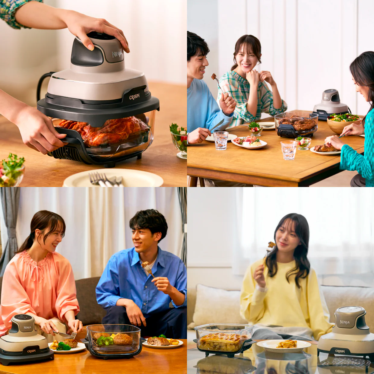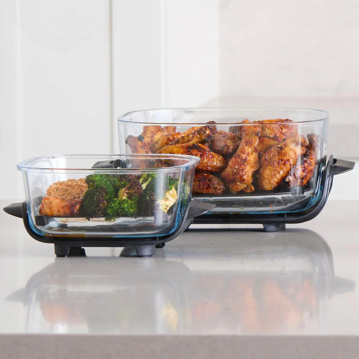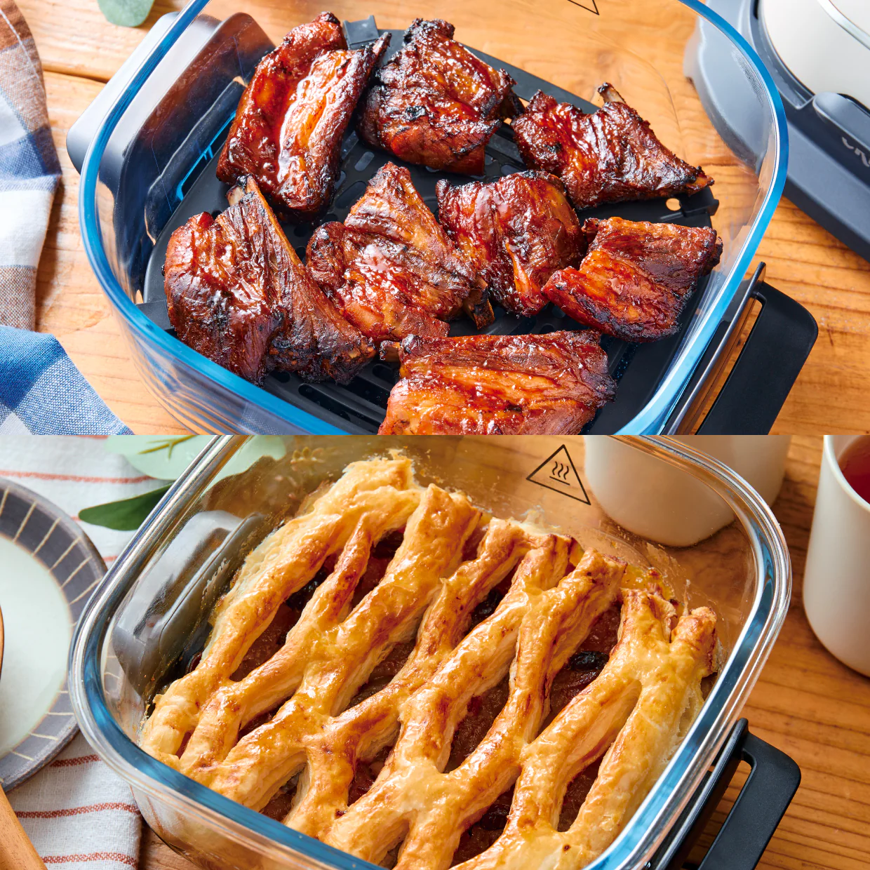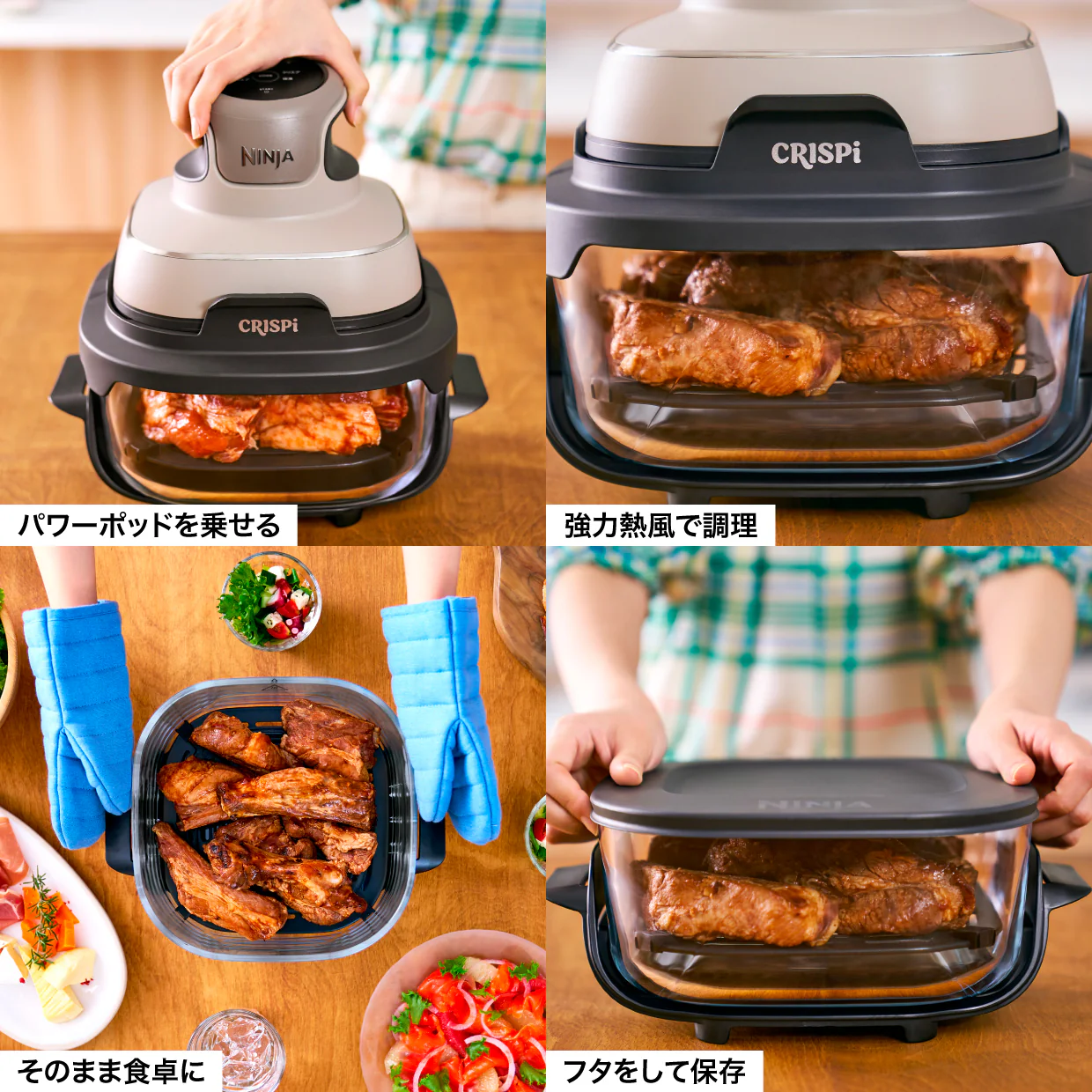 ガラスコンテナに食材を入れて、そのまま調理、サーブし、保存もできる新感覚テーブルクッカー。強力熱風、高火力、高熱伝導プレートで食材を包み込み、むらのない本格的な仕上がりに。