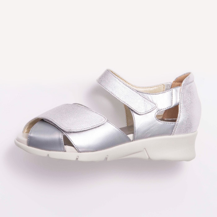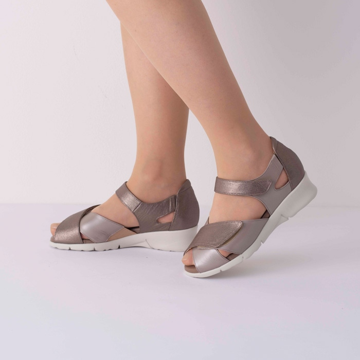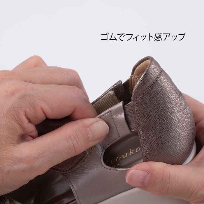 履き口のかかと側に柔らかなクッションを内蔵し、優しい足当たりに仕上げました。足首と甲部のベルトは面ファスナー仕様で、足にあわせて細やかに調整していただけます。かかと両サイドの隠しゴムが足の動きに合わせて伸縮し、適度なホールド感をもたらします。