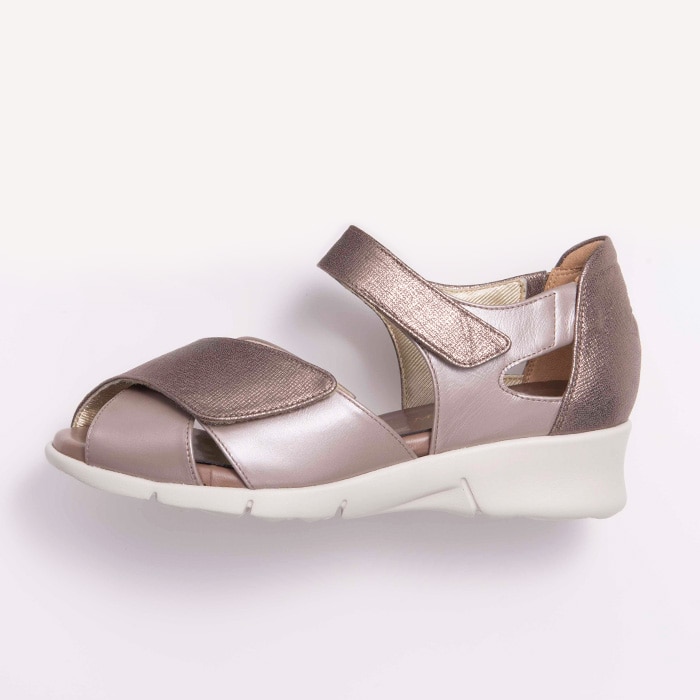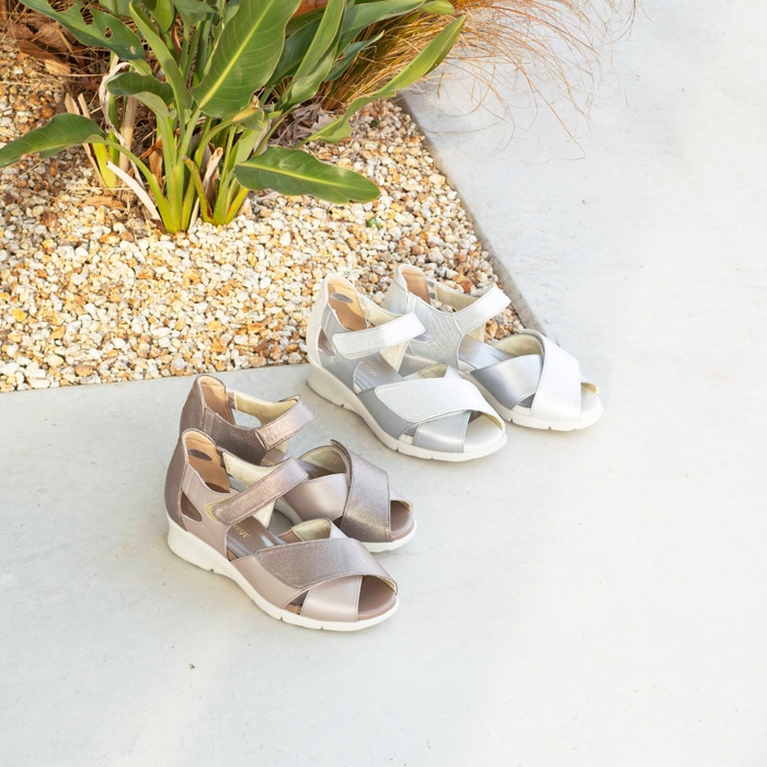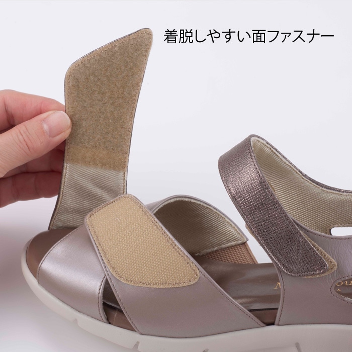 履き口のかかと側に柔らかなクッションを内蔵し、優しい足当たりに仕上げました。足首と甲部のベルトは面ファスナー仕様で、足にあわせて細やかに調整していただけます。かかと両サイドの隠しゴムが足の動きに合わせて伸縮し、適度なホールド感をもたらします。