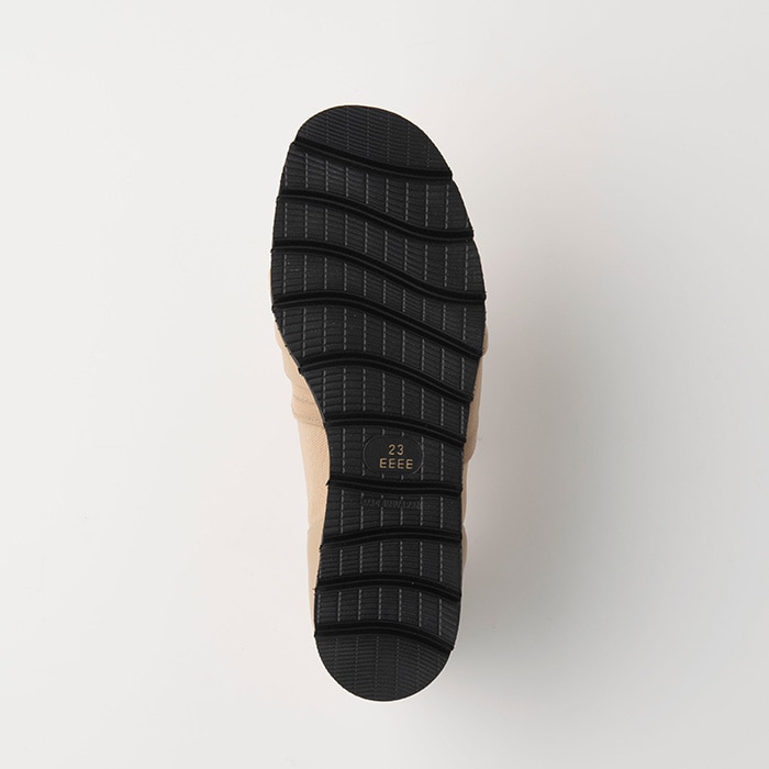 ソールにはクッション性とグリップ力に優れた材料を使用。また、ソールに適切な位置で切り込みを入れることで屈曲性を高めました。安定感があり、長時間の歩行でも疲れにくいです。