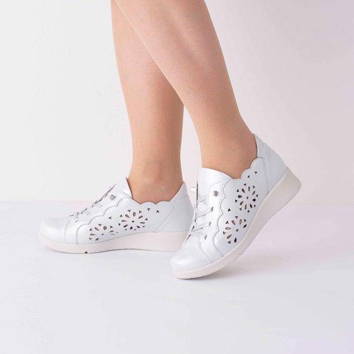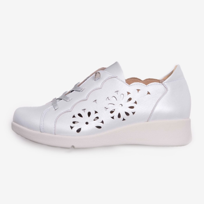 お花やレースをイメージしたカットワークで"可愛らしさ"を、ラメ紐やパール感のある牛革で"エレガントさ"を演出したスニーカー。