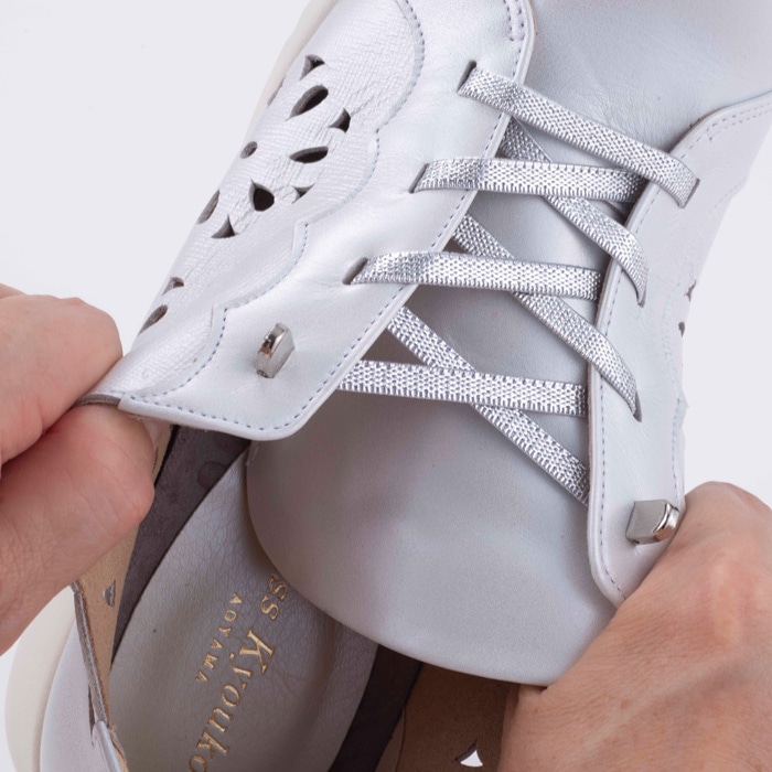 お花やレースをイメージしたカットワークで"可愛らしさ"を、ラメ紐やパール感のある牛革で"エレガントさ"を演出したスニーカー。