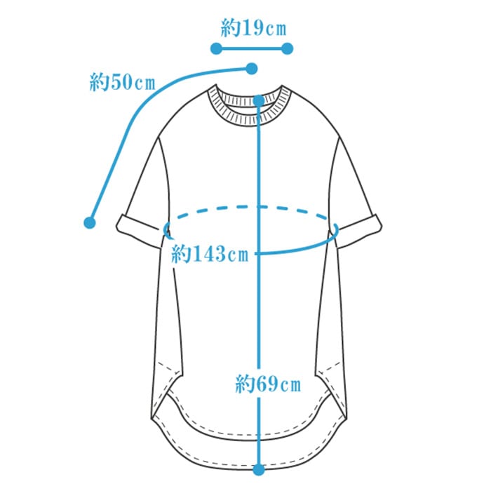 | サイズ | M-L(ワンサイズ) 着丈:69cm バスト:110cm 袖丈:23cm 肩幅:53.5cm |