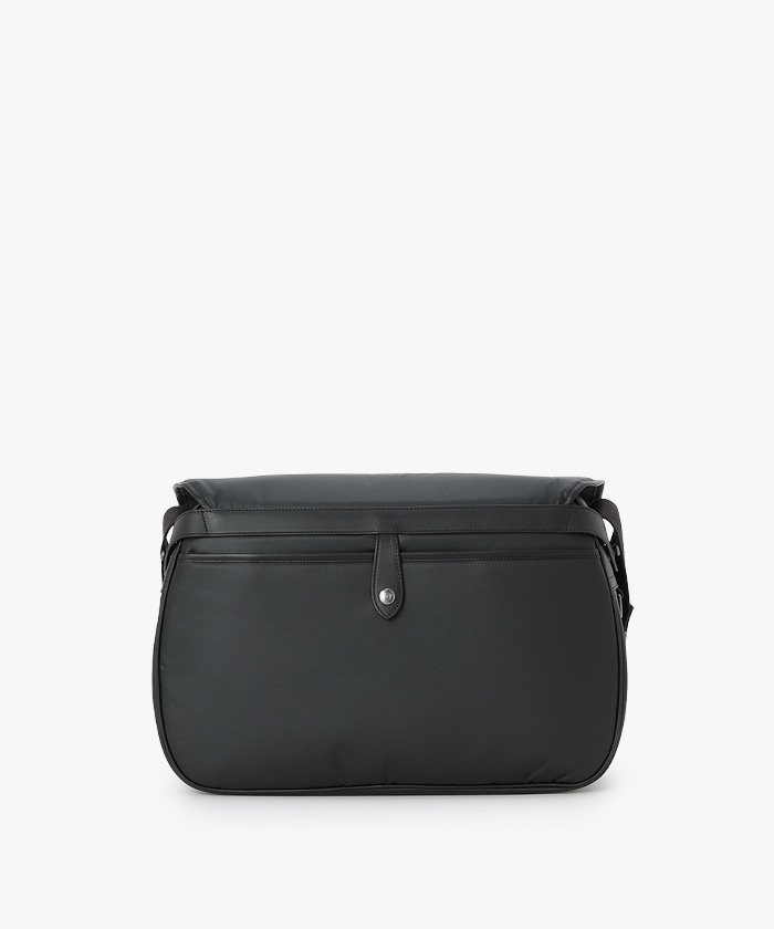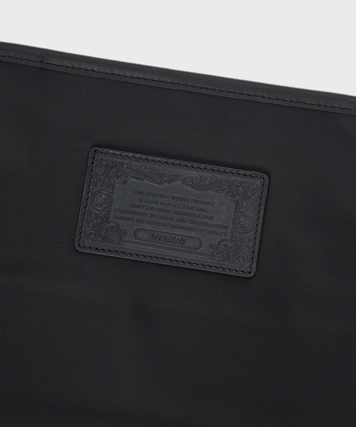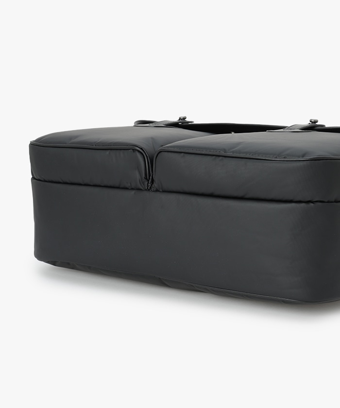 ノートPCやタブレットなど16インチのガジェットが収納可能なサイズ感。背面にレザーのパイピングを施し、自立する設計に。