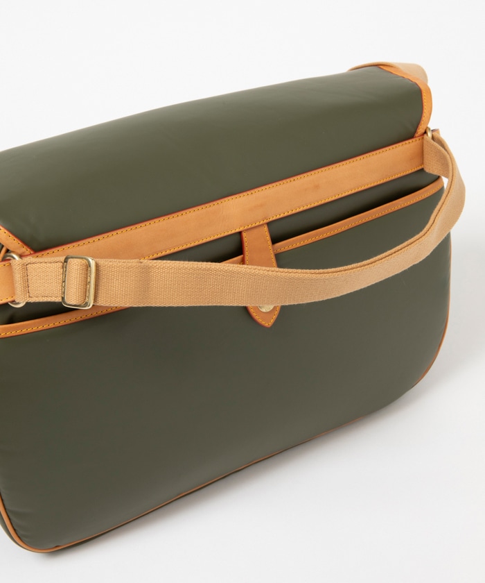 ノートPCやタブレットなど16インチのガジェットが収納可能なサイズ感。背面にレザーのパイピングを施し、自立する設計に。