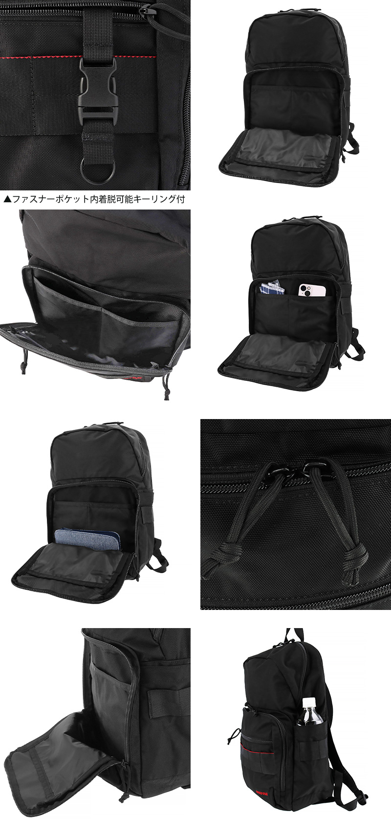 ファスナーポケット×2(オープンポケット×2、着脱可能キーリング×1)